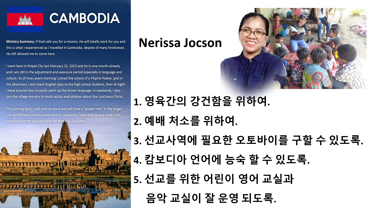 캄보디아 파송 선교사 Nerissa Jocson 기도 부탁드립니다.